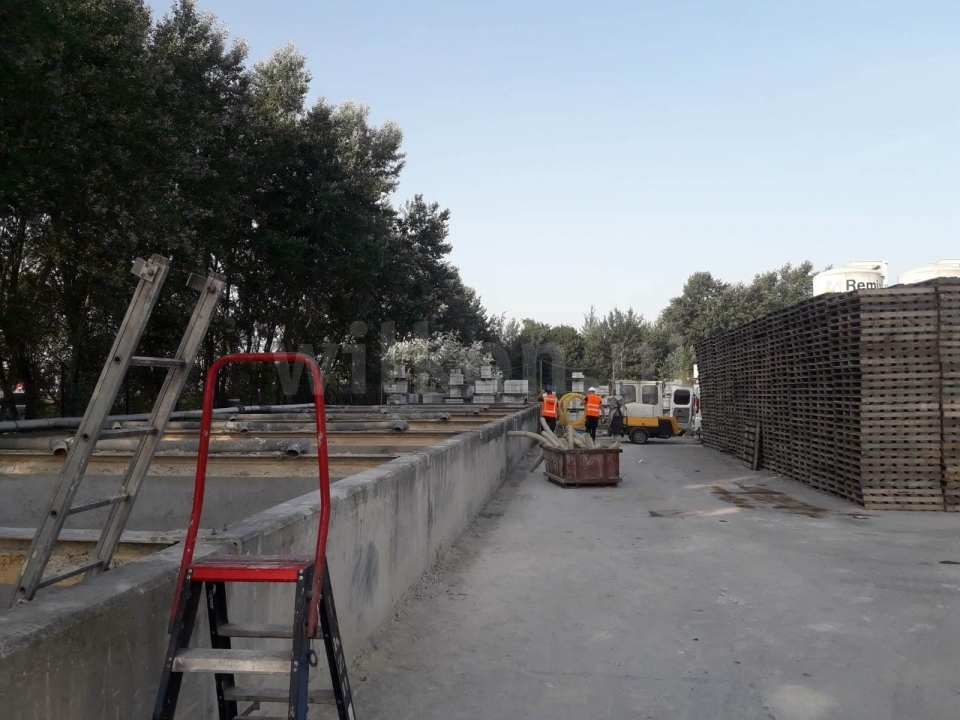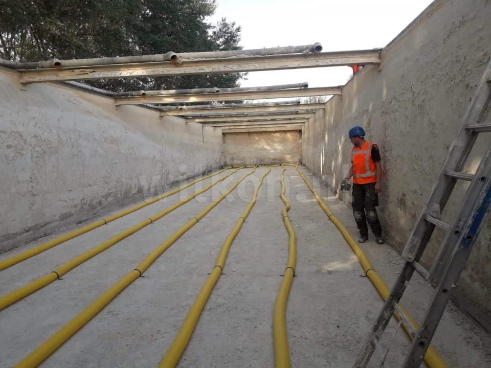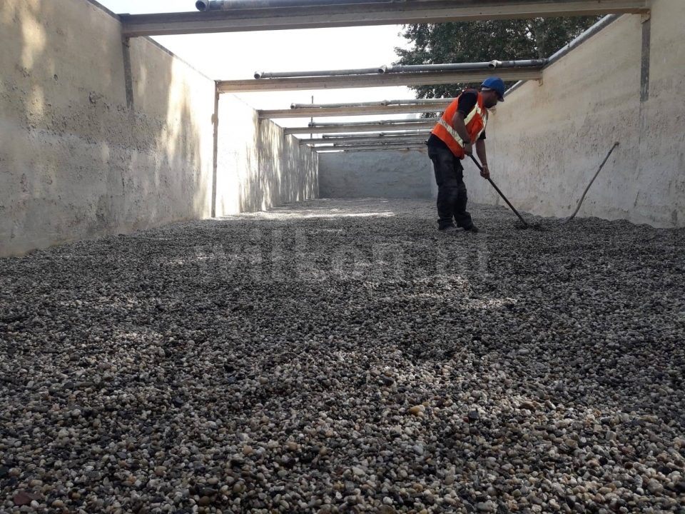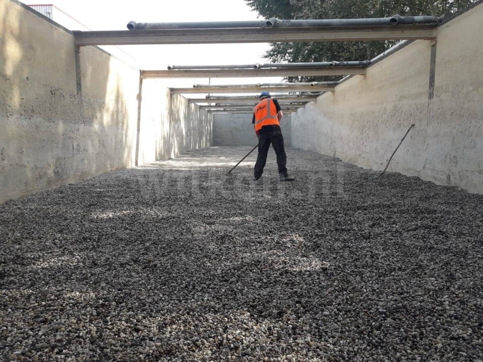 Bij een kalkzandsteenfabriek drainage aangelegd om zo het water wat nog in het zand zit af te voeren. over de drainage word grind gelegd om zo een goed werkende afvoer te creeren.