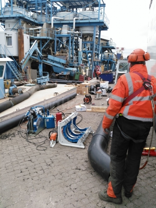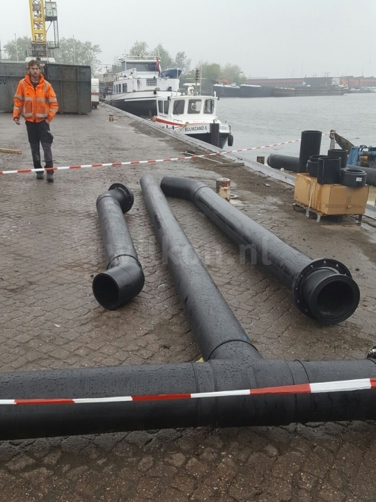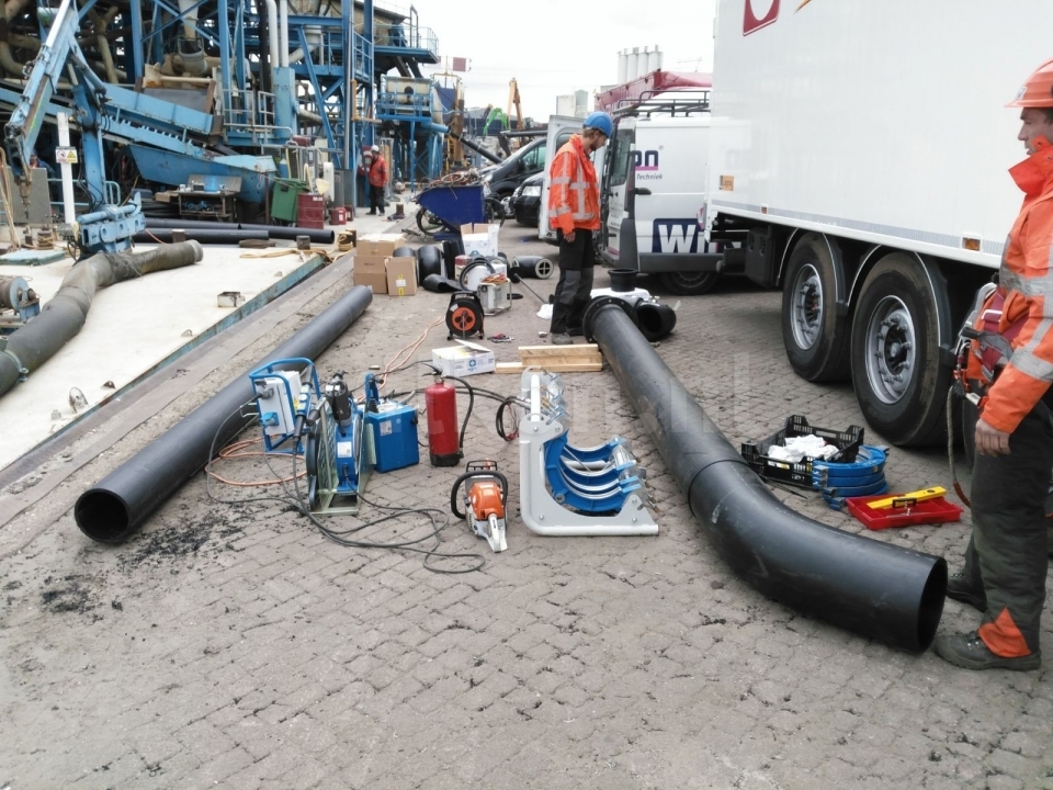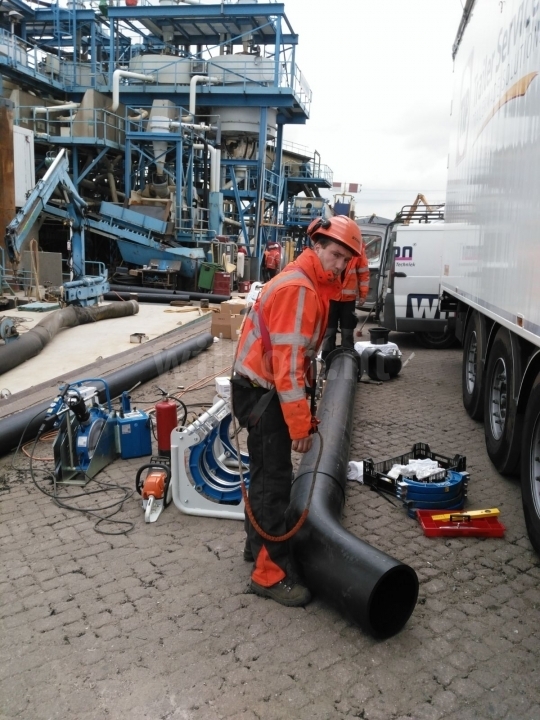 PE100 280 mm SDR 17 leiding spiegellassen. Alles geheel op locatie op maat ingemeten en gemaakt.