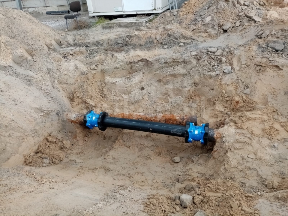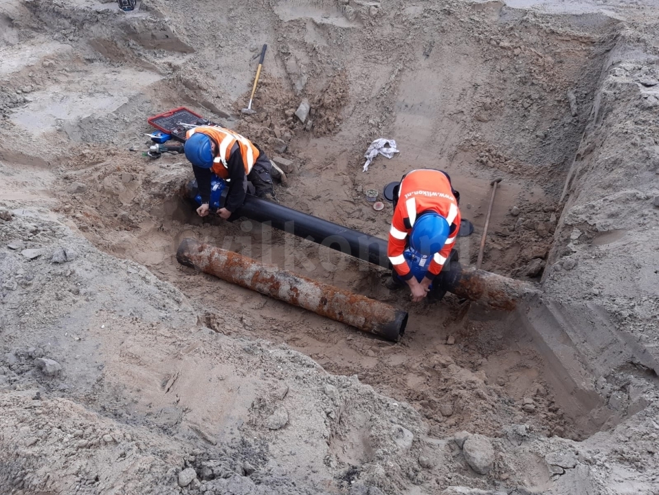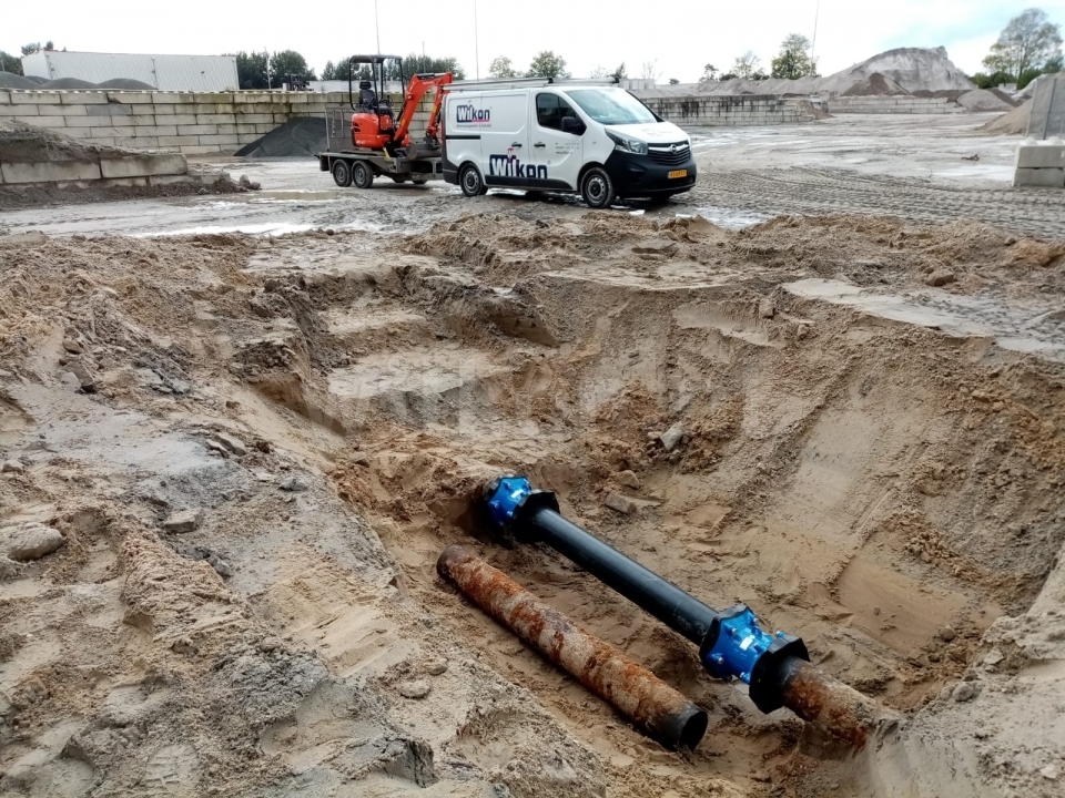 Noodreparatie uitvoeren bij een industriële klant. De oude stalen leiding is op meerdere plekken lek. Vervangen kan niet even snel. Dus repareren wij de leiding en vervangen een stuk voor PE100 200mm leiding.